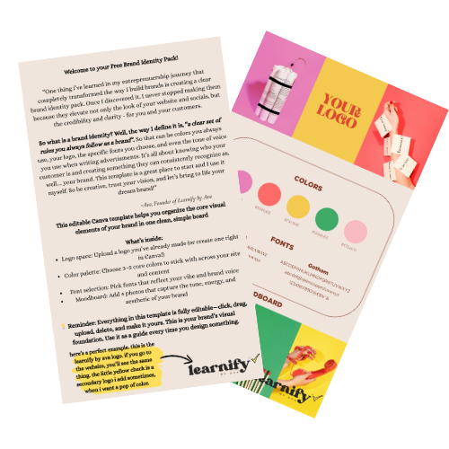 If you’re ready to start your journey, I’d love to send you a free Brand Identity Pack to help you get started — this is a template I use when building literally all of my brands, and it allows you to organize your brand colors, fonts, and logos all in one place. No fluff, no overwhelm, just a clear way to make your business feel professional from day one.